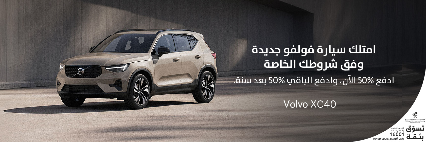 امتلك سيارة فولفو XC40 وادفع 50% الآن، والباقي بعد سنة. ضمان لـ 5 سنوات أو 100,000 كيلومتر. تسجيل مجاني لمدة سنة .