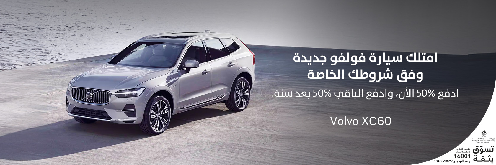امتلك سيارة فولفو XC60 وادفع 50% الآن، والباقي بعد سنة. ضمان لـ 5 سنوات أو 100,000 كيلومتر. تسجيل مجاني لمدة سنة.
